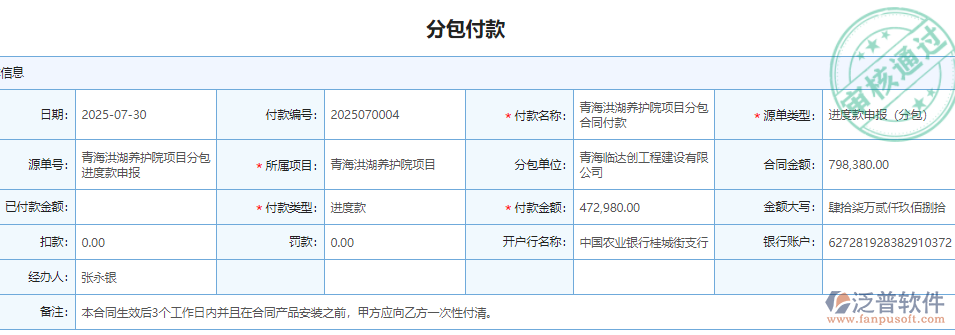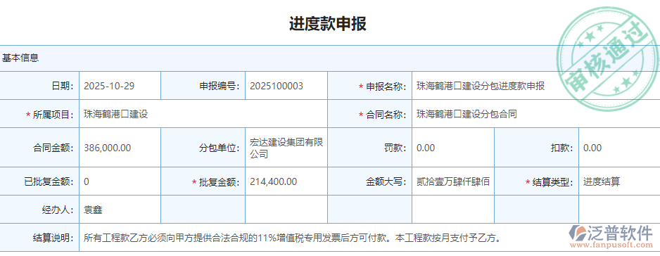 4、 通過系統(tǒng)的進度款申報,對分包出去的工程能進行實時跟蹤,對每一筆費用都有記錄,方便后期查找和做成本統(tǒng)計。