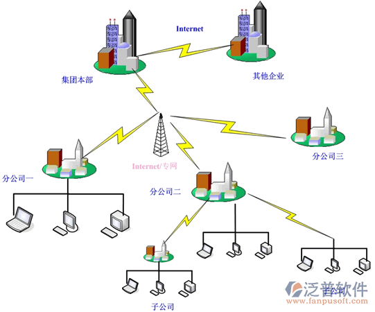 3、 規(guī)模較大或還有子公司的分公司在其內(nèi)部部署二級系統(tǒng),通過Internet(或?qū)>W(wǎng))實現(xiàn)和集團的互聯(lián)。