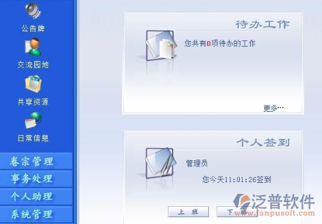 我們一般使用OA辦公系統(tǒng),綜合辦公系統(tǒng)功能包括流程事務,信息交流,無紙化辦公,人力資源,財務管理等,一般用泛普軟件都還不錯,現(xiàn)在OA很普及了。。