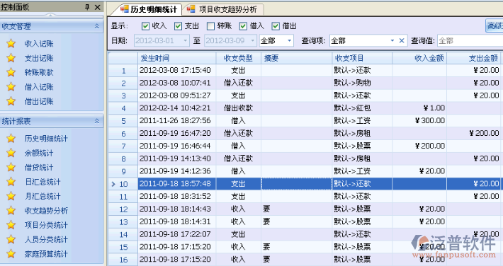 財務(wù)系統(tǒng)軟件包括當日明細統(tǒng)計,歷史明細統(tǒng)計,賬戶余額統(tǒng)計,日匯總統(tǒng)計,月匯總統(tǒng)計,科目收支結(jié)構(gòu)分析,科目收支趨勢分析,科目分類統(tǒng)計,人員分類統(tǒng)計,客戶收支統(tǒng)計,客戶往來明細統(tǒng)計,客戶收支結(jié)構(gòu)分析,客戶收支趨勢分析,員工借款明細統(tǒng)計,員工借款匯總統(tǒng)計,轉(zhuǎn)賬統(tǒng)計,賬戶綜合統(tǒng)計。