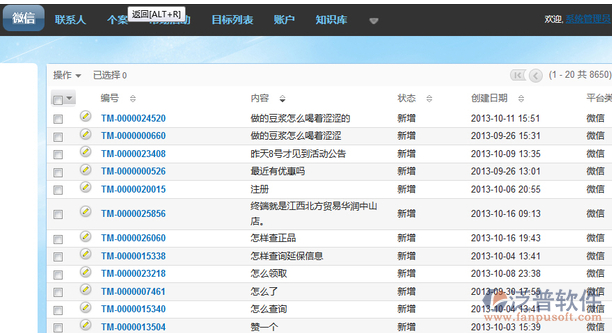二是整個(gè)微信CRM生態(tài)系統(tǒng)尚不完善?,F(xiàn)有的主流CRM系統(tǒng)產(chǎn)品商對(duì)微信的反應(yīng)過(guò)慢,規(guī)?;?、產(chǎn)品化的對(duì)接平臺(tái)還沒(méi)推出。如何提高傳統(tǒng)CRM的互動(dòng)性,讓整個(gè)生態(tài)系統(tǒng)的快速建立,這是當(dāng)務(wù)之急。(泛普軟件最新資訊)