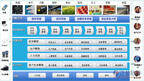 泛普軟件ERP系統(tǒng)平臺覆蓋了電子、塑膠、化工、機械、汽配、醫(yī)藥、食品、服裝等不同企業(yè)行業(yè)應(yīng)用,集成了各行各業(yè)的個性化需求。