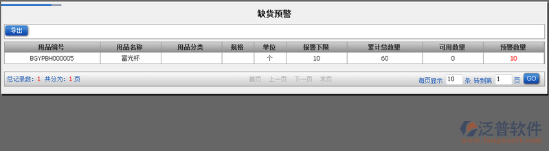 缺貨預(yù)警為我們及時購買辦公用品提供幫助,當(dāng)某一個辦公用品低于我們的報(bào)警下限,系統(tǒng)將會把該辦公用品信息自動進(jìn)行缺貨預(yù)警提醒,用戶在缺貨預(yù)警功能中即可看到哪些辦公用品需要及時購買。