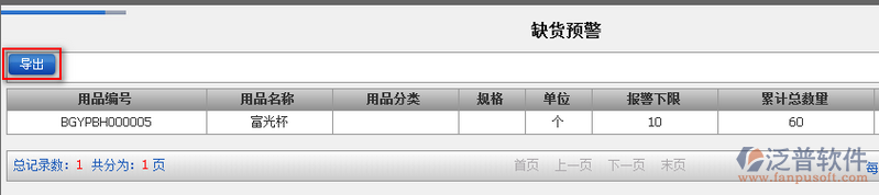 2、點(diǎn)擊【導(dǎo)出】即可將所有的缺貨預(yù)警信息導(dǎo)入出來,方便我們拿去對照單子進(jìn)行購買缺貨的辦公用品