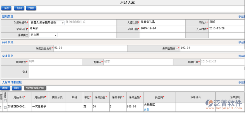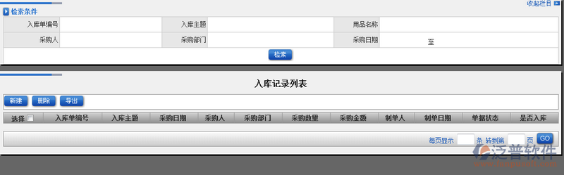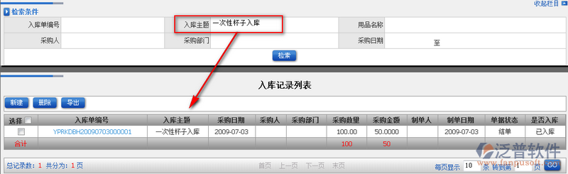 ERP系統(tǒng)中入庫記錄主要對已經入庫的辦公產品進行留痕處理,庫存中發(fā)現(xiàn)數(shù)據(jù)不對時,即可通過入庫記錄進行對比。入庫記錄可以通過以下屬性進行查詢:入庫單編號、入庫主題、用品名稱、采購人、 采購部門、采購日期進行查詢。