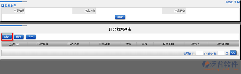 1、點擊【用品檔案】進入用品檔案列表主頁面,在此頁面中用戶可以進行【新增】用品檔案操作。如圖: