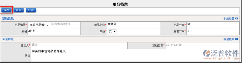 3、保存完的用品檔案,系統(tǒng)提供直接打印功能。點擊【打印】即可將此產(chǎn)品信息進行打印操作