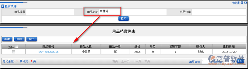 4、用戶檔案系統(tǒng)提供查詢功能,可以按照用品編碼、用品名稱、用品分類進行模糊查詢。如圖: