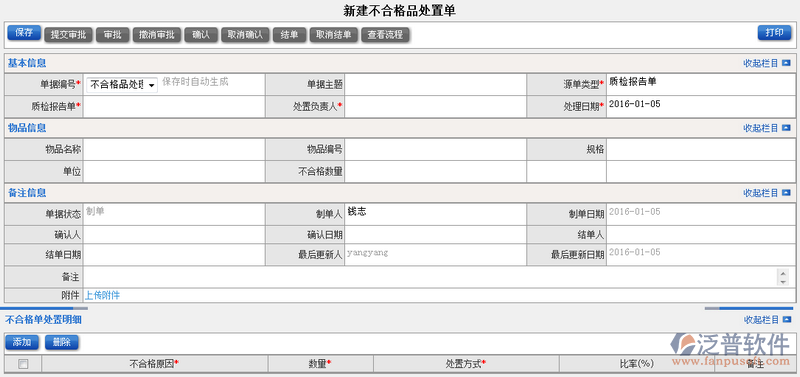 1、點(diǎn)擊【新建不合格品處置單】進(jìn)入主頁面,在此頁面中便可添加新的不合格品處置單。如圖: