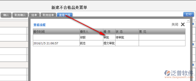 3、提交審批后的不合格品處置單可以通過【查看流程】詳細(xì)查看審批情況。如圖: