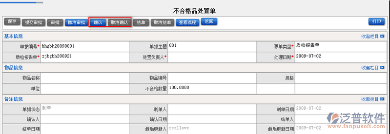 5、審批通過后的流程得到確認(rèn)后,便可對(duì)其相關(guān)的不合格品處置單進(jìn)行【結(jié)單】操作。如圖: