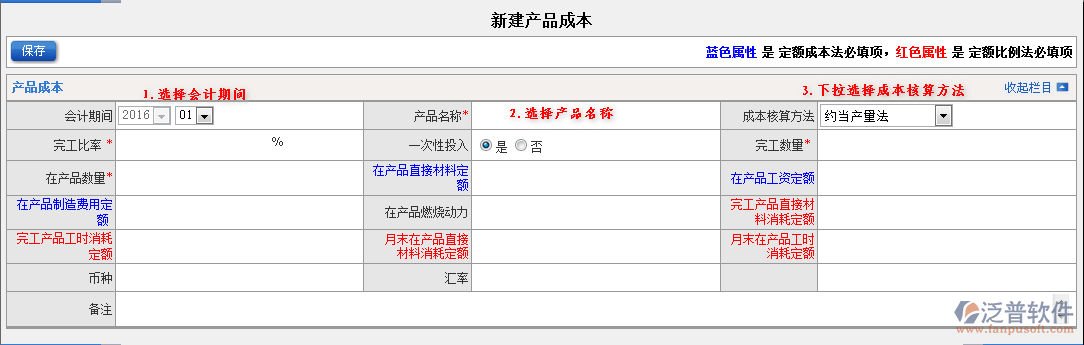 注意:藍色屬性是定額成本法必填項,紅色屬性是定額比例法必填項