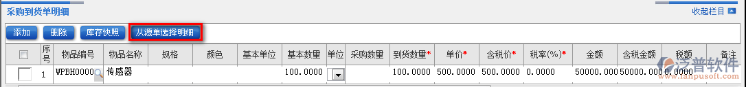 (4)填寫采購到貨單明細(xì)(一般從采購訂單自動(dòng)獲取)
