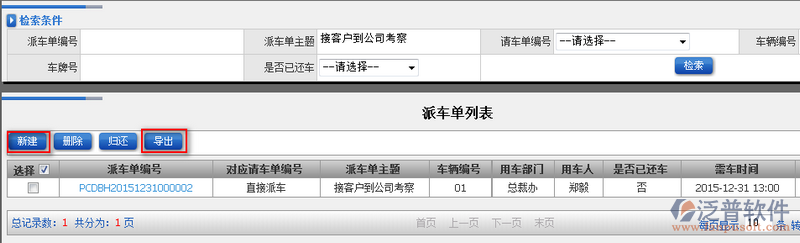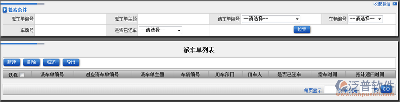 上一節(jié)我們講到如何創(chuàng)建新的派車單,這一節(jié)主要講解如何對創(chuàng)建好的派車單進行管理。【派車單列表】功能主要對所有的派車單進行一個統(tǒng)一管理,派車單列表提供了模糊檢索查詢功能,檢索條件主要包含的屬性有:派車單編號、派車單主題、請車單編號、車輛編號、車牌號、是否已還車