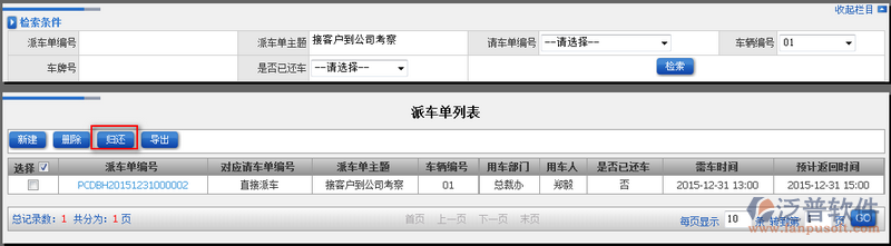 4、使用完的車輛,選中對應消息,點擊【歸還】即可完成車輛的歸還操作。如圖: