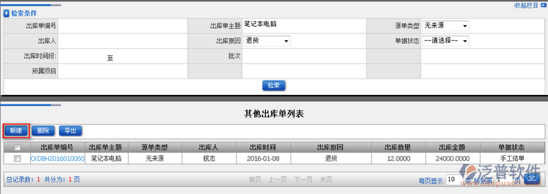 5、在查詢頁面中,ERP系統提供新增功能。點擊【新建】即可進入其他出庫單信息的新增頁面。如圖: