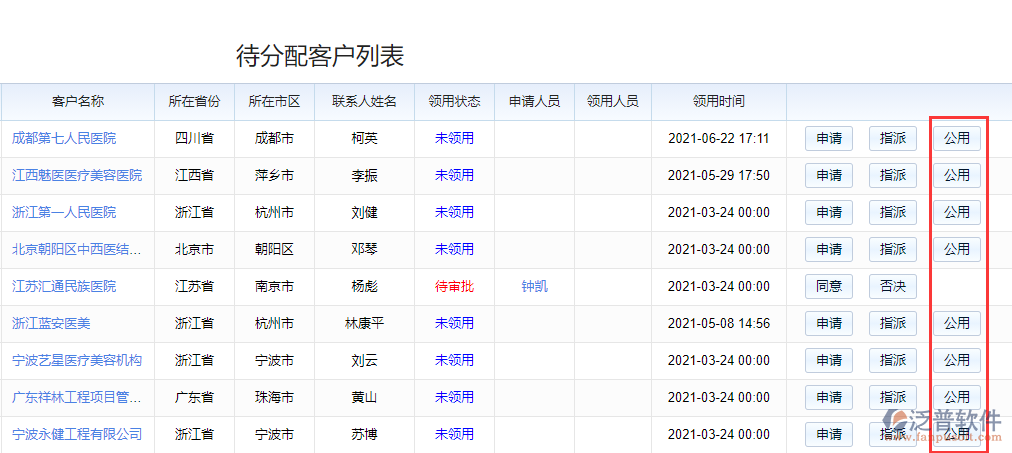 相當(dāng)于企業(yè)常說(shuō)的客戶公海,在當(dāng)前表中可以查看公共的客戶資源,將公??蛻舴峙浠蛏暾?qǐng)給某些銷售人員,且在期限內(nèi)必須有跟單,否則客戶就會(huì)自動(dòng)回歸公海客戶池中,重新分配給其他銷售。
