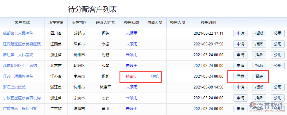 2、銷售人員可以在此表中對(duì)客戶進(jìn)行【申請(qǐng)】,由銷售部門領(lǐng)導(dǎo)來(lái)決定是否同意給銷售人員。同時(shí)在當(dāng)前這個(gè)表中可以查看到是由哪個(gè)銷售人員申請(qǐng),銷售領(lǐng)導(dǎo)是否審核的狀態(tài)在此表中都可以體現(xiàn)出來(lái),這樣也能避開(kāi)銷售人員出現(xiàn)撞單的情況