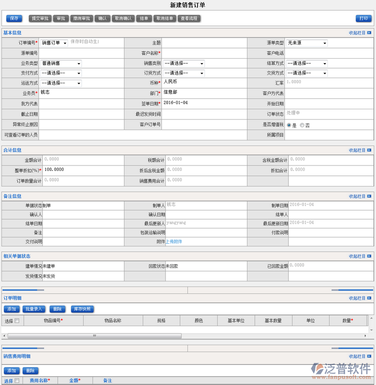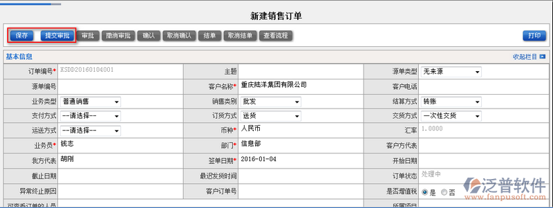 2、填寫完銷售訂單中的基本信息、合計信息、備注信息以及訂單、銷售相關(guān)費用后,便可點擊【保存】進入【提交審批】狀態(tài)。如圖: