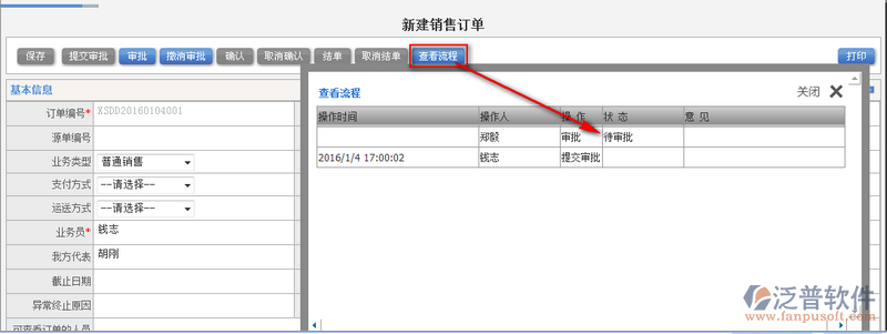 3、提交審批后的流程,可以通過【查看流程】對其提交審批的流程進行查看審批狀態(tài)。如圖:
