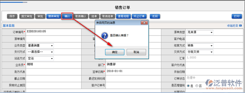 4、審批通過的銷售訂單,用戶可對其確認,點擊【確認】即可對銷售訂單進行查看。如圖: