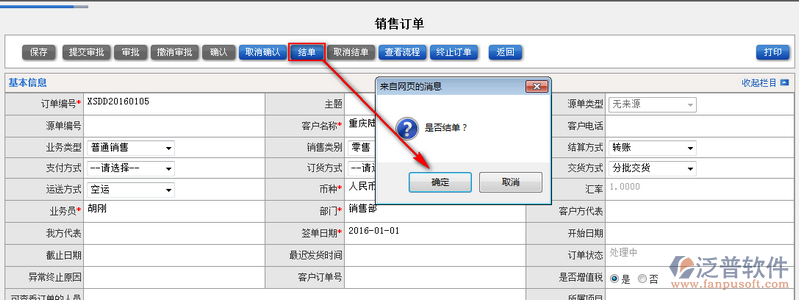 5、確認后的銷售訂單便可對其客戶進行發(fā)貨準備,客戶接收到相關(guān)貨物時用戶便可在銷售訂單中進行【結(jié)單】操作。如圖: