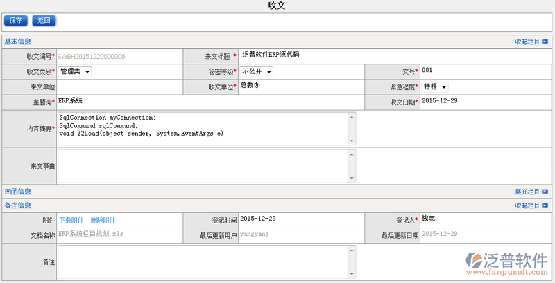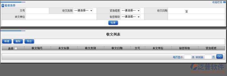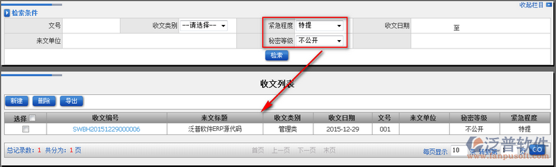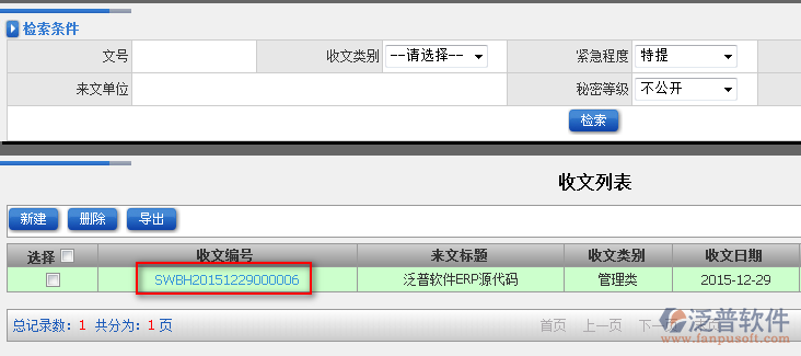 ERP系統(tǒng)中收文列表主要對(duì)新創(chuàng)建的收文進(jìn)行一個(gè)統(tǒng)計(jì),【收文列表】可以統(tǒng)計(jì)所有的收文情況。同時(shí)在收文列表中可以通過(guò):文號(hào)、收文類(lèi)別、緊急程度、收文日期、來(lái)文單位等相關(guān)信息進(jìn)行模糊查詢(xún),方便在收文比較多的情況下檢索