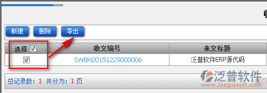 5、查詢(xún)到的收文,可以按照用戶(hù)的需要進(jìn)行導(dǎo)出處理。選中需要導(dǎo)出的收文,點(diǎn)擊【導(dǎo)出】即可完成此收文的導(dǎo)出。如圖: