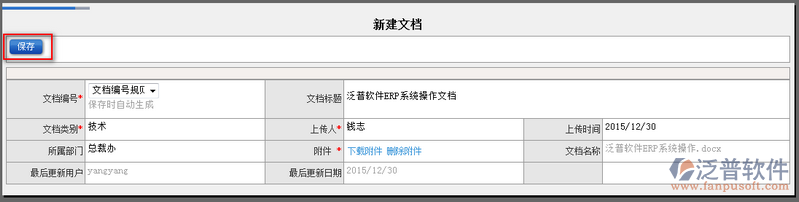 文檔如何在系統(tǒng)中進(jìn)行保存呢?ERP系統(tǒng)提供了【新建文檔】功能模塊,在此模塊中主要對公司或者部門的文檔進(jìn)行保存。新建文檔主要屬性包括:文檔編號、文檔類別、上傳人、上傳附件、文檔名稱等相關(guān)信息填寫。