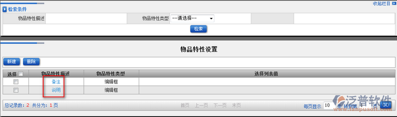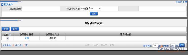 1、點(diǎn)擊【物品特性設(shè)置】進(jìn)入主界面,在此頁面中可以通過檢索條件進(jìn)行模糊查詢。如圖: