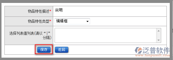 3、填寫完新增頁面的相關(guān)信息,點(diǎn)擊【保存】即可完成物品特性的新增。如圖: