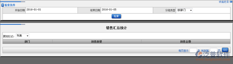 1、點(diǎn)擊【銷售統(tǒng)計(jì)】進(jìn)入主界面,在此頁面中上半部分為檢索條件下半部分為匯總統(tǒng)計(jì)顯示的地方。如圖: