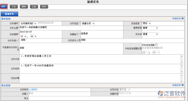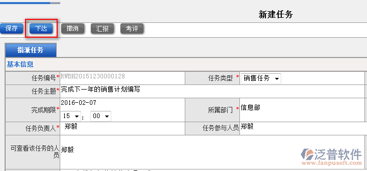 4、保存好的指派任務(wù),就可以對相應(yīng)的人員進行【下達】操作。如圖: