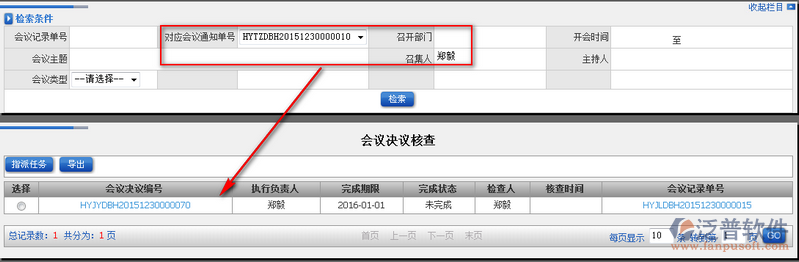 2、通過圖1中上半部分的檢索條件,可以查詢出我們想要的會議決議記錄,如圖: