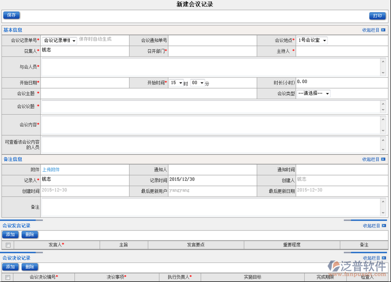 2、填寫完相關(guān)信息,點(diǎn)擊【保存】即可完成會(huì)議記錄的填寫。如圖: