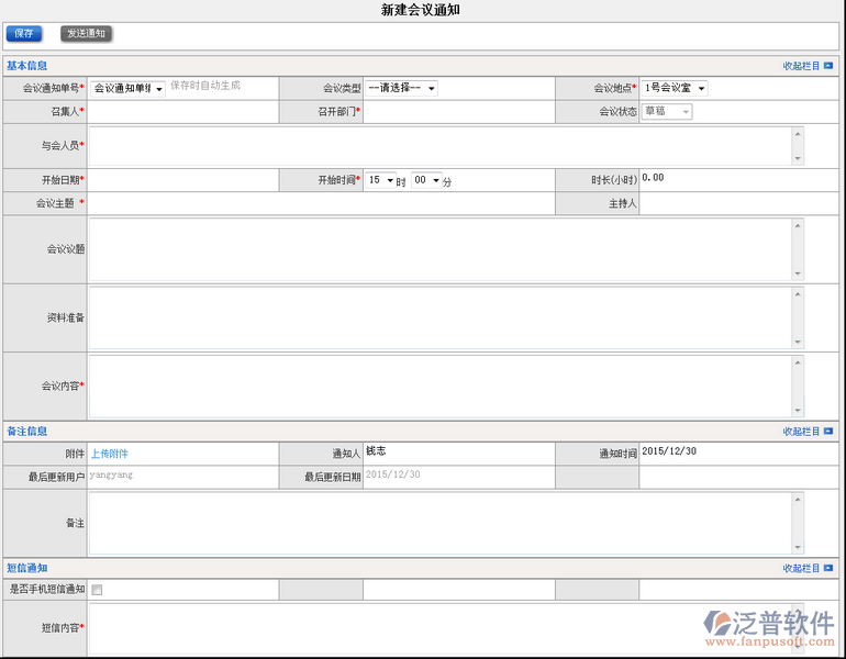1、點擊【新建會議通知】進入會議通知的新增頁面,如圖: