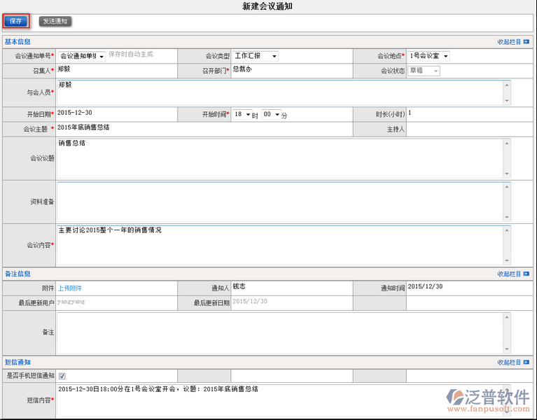 2、填寫完主頁面中相關字段,點擊【保存】即可完成會議通知的填寫。如圖: