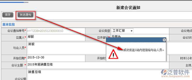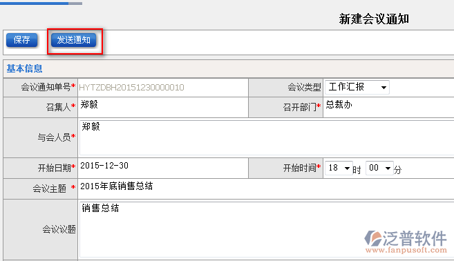 3、保存后的會議通知,點擊【發(fā)送通知】即可發(fā)送給對應的參與人員提醒信息。如圖: