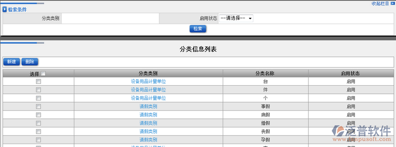 分類(lèi)屬性設(shè)置功能主要對(duì)系統(tǒng)中所有需要進(jìn)行選擇的分類(lèi)欄目進(jìn)行統(tǒng)一管理。此處分類(lèi)屬性主要包括:會(huì)議分類(lèi)、收發(fā)文類(lèi)別、請(qǐng)假類(lèi)別、設(shè)備用品計(jì)量單位、請(qǐng)示類(lèi)型,這些模塊中的類(lèi)別都在此處進(jìn)行設(shè)置。分類(lèi)屬性設(shè)置還為用戶(hù)提供模糊查詢(xún)功能,可以通過(guò):分類(lèi)類(lèi)別、啟用狀態(tài)進(jìn)行模塊查詢(xún)。