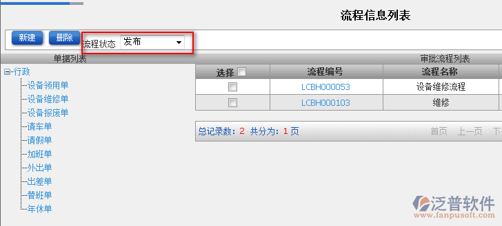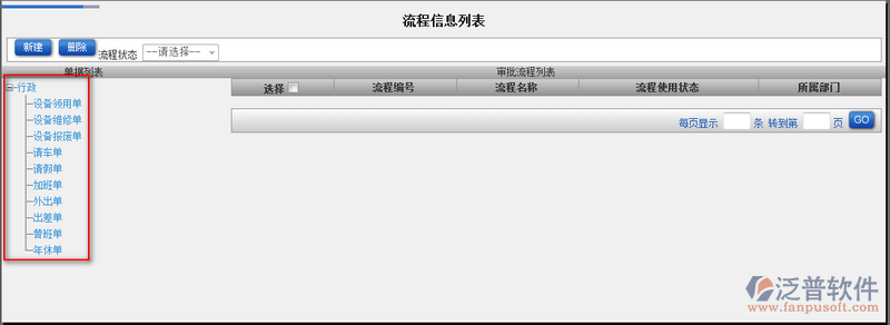 1、點(diǎn)擊【審批流程設(shè)置】進(jìn)入流程信息列表頁面。頁面左邊為系統(tǒng)中需要審批的頁面。如圖:
