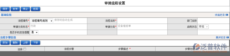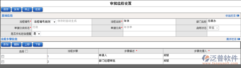 3、填寫完審批流程中的基本信息,以及流程步驟信息,點(diǎn)擊【保存】即可完成流程的配置操作。如圖: