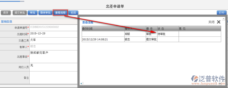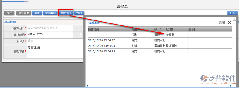 3、撤銷審批在發(fā)現(xiàn)填寫內(nèi)容有錯,同時審批人未審批狀態(tài)下,可以進(jìn)行【撤銷審批】操作。點(diǎn)擊【查看流程】即可看到此條流程的審批狀態(tài)。