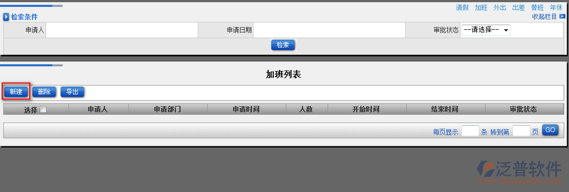 1、點(diǎn)擊右上角【加班】進(jìn)入加班新增查詢頁面,在此頁面中可以進(jìn)行模糊查詢,同時可以新增加班申請,如圖: