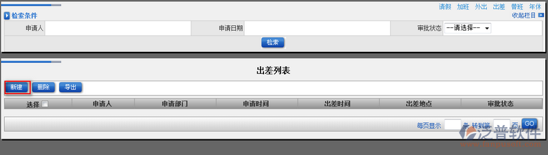 1、點(diǎn)擊右上角【出差】進(jìn)入出差列表頁面,在此頁面中可以進(jìn)行模糊查詢。同時添加新的出差申請。如圖: