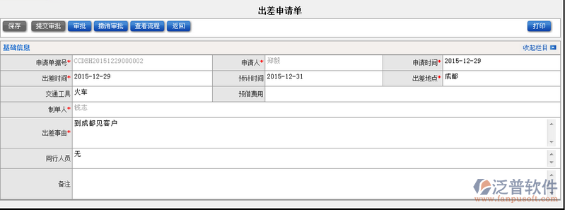 2、點(diǎn)擊【新建】進(jìn)入出差申請的新增頁面,填寫完頁面中的需求,點(diǎn)擊【保存】然后提交審批,我們的出差申請就表示為發(fā)起成功。耐心等待領(lǐng)導(dǎo)的審批。如圖: