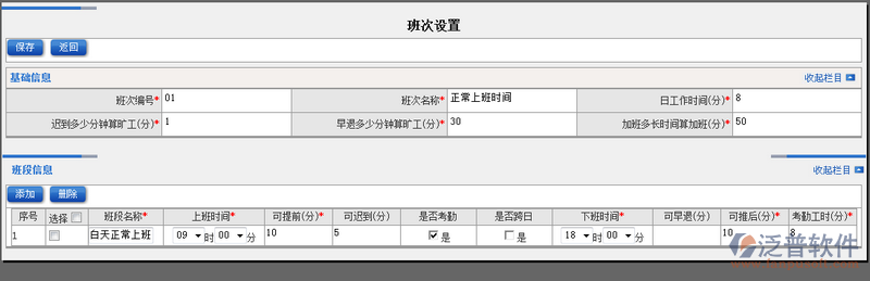 2、點擊【新建】進入班次的新增頁面。填寫完相關(guān)信息點擊【保存】即可完成班次的創(chuàng)建。如圖: