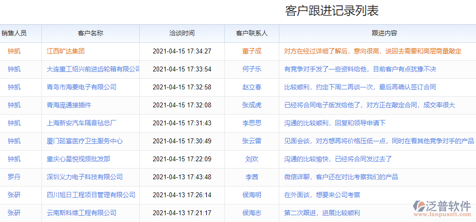 5、系統(tǒng)中的客戶跟進部分,需要銷售人員對自己客戶每次的跟進記錄情況進行登記,其中包括跟進過程中客戶的建議或者需求相關(guān)文件通過附件上傳,后期銷售經(jīng)理在進行點評的時候可以查看到客戶的需求建議,同時將銷售人員跟進客戶的過程進行管控,避免銷售人員趁外出渾水摸魚