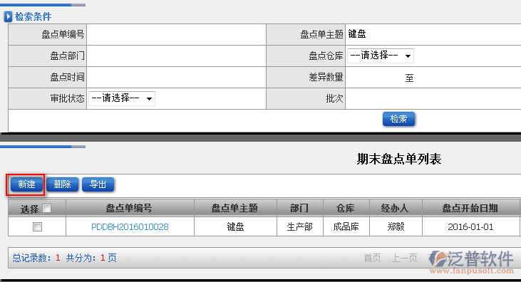 5、在查詢到的頁(yè)面中,點(diǎn)擊【新建】即可進(jìn)入期末盤(pán)點(diǎn)單的新增。如圖: