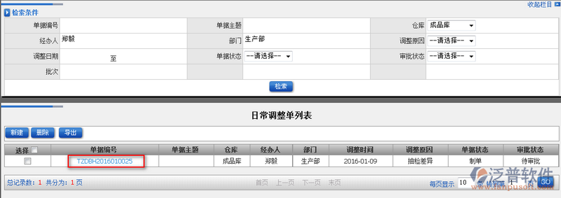 2、通過上圖中的檢索條件,用戶可根據(jù)自己的需求快速查詢到日常調(diào)整單列表中的信息。如圖: