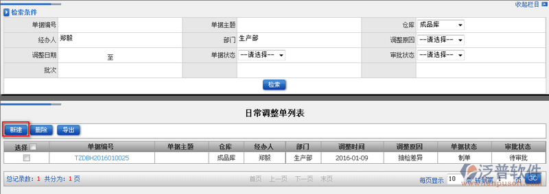 5、日常調(diào)整單列表中,點(diǎn)擊【新建】即可進(jìn)入新增頁面。如圖: